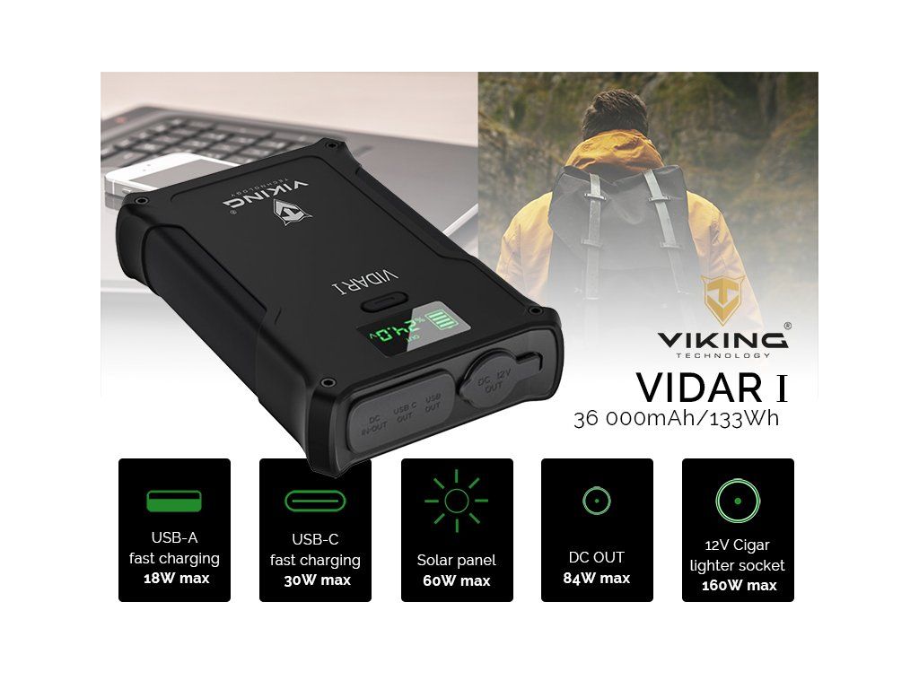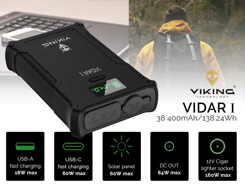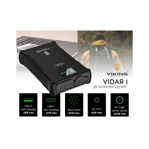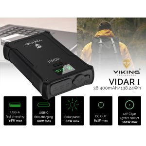 Outdoorová powerbanka Viking VIDAR I • Kapacita: 38400mAh/138Wh • Maximálny výkon: 160W • Široká škála vstupov a výstupov (USB-A, USB-C, Cigaretová zásuvka, DC-jack) • Možnosť solárneho napájania • Funkcia Pass-Throu