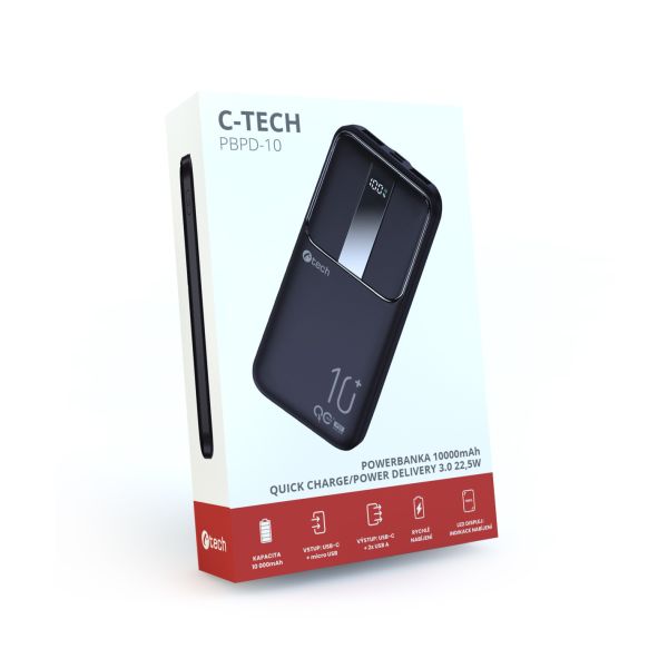 Powerbanka C-tech 10000mAh, Li-Pol, 22,5 W, USB-C/USB-A/micro USB PBPD-10