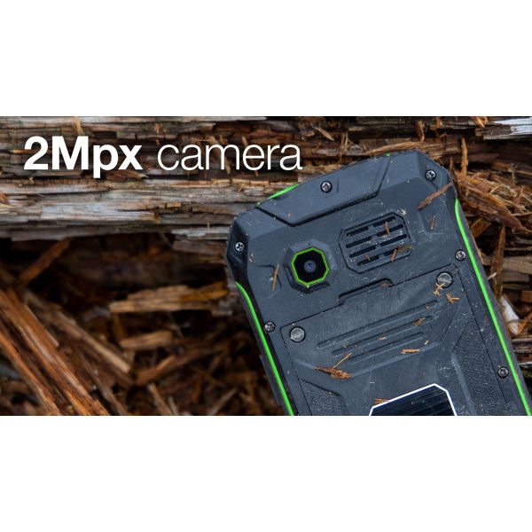 Súčasťou výbavy odolného telefónu je 2 Mpx fotoaparát, výkonné LED svítidlo alebo vstavané FM rádio s integrovanou anténou a automatickým ladením stanic. Z ďalšej výbavy môžete využiť napríklad kalendár, budíky alebo kalkulačku.