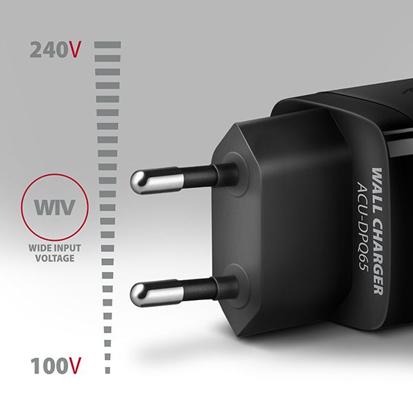 Cestovná nabíjačka do siete AXAGON ACU-DPQ65 GaN umožňuje rýchle nabíjanie až troch mobilných zariadení súčasne. Vďaka celkovému výkonu 65W dokáže nabíjačka dobíjať notebooky, telefóny a ďalšie mobilné zariadenia najvyššou možnou rýchlosťou. Adaptér ponúka nielen štandardný USB-A konektor, ale aj dva oboustranné USB-C konektory.