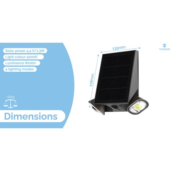 Podľa potreby si môžete vybrať zo štyroch režimov svietenia. PIR senzor má 120° uhol detekcie a 5metrový dosah. Viking SR39 je perfektnou voľbou pre bezpečné a spolehlivé osvetlenie vonkajších priestorov.