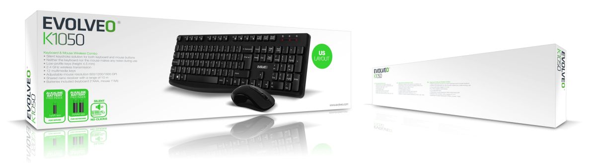 EVOLVEO K1050, tichý set bezdr. klávesnice a myši, US INTL, čierna