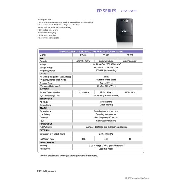 FSP UPS FP 800, 800 VA / 480 W, line interactive PPF4800407