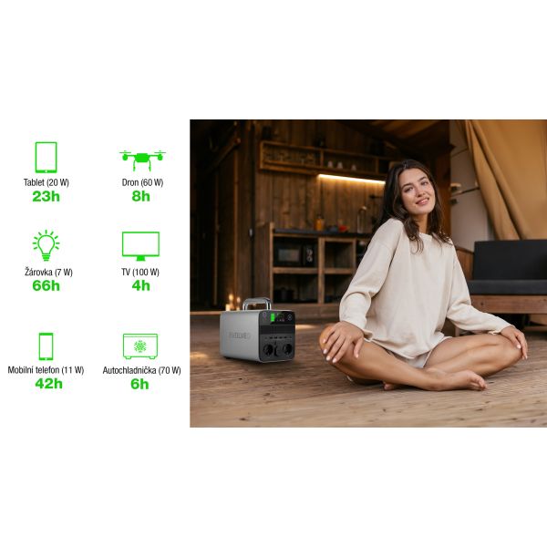 • Výdrž napájania spotrebiča: tablet (20 W) – 23 h, dron (60 W) – 8 h, mobilný telefón (11 W) – 42 h, žiarovka (7 W) – 66 h, TV (100 W) – 4 h, autochladnička (70 W) – 6 h