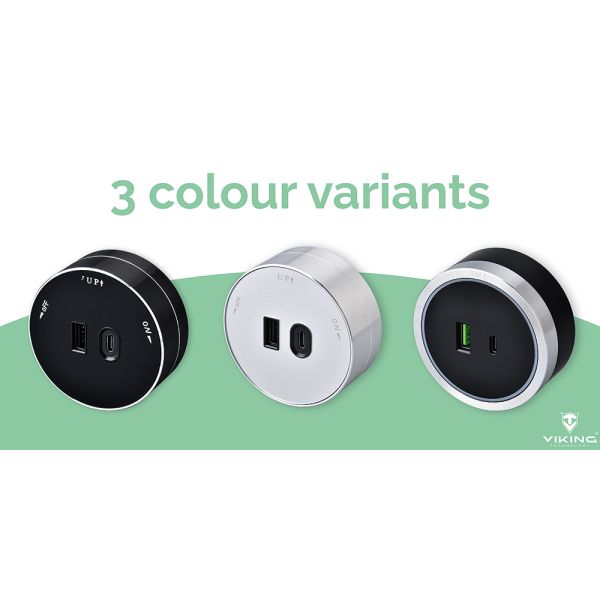 Zásuvkový modul Viking A60 je vybavený jedným USB-A výstupom (5V/2,4A) a jedným USB-C výstupom (5V/3,6A, PD) a je k dispozícii v troch farebných variantoch.