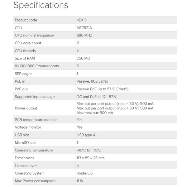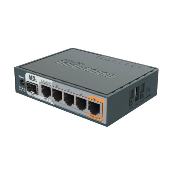 RouterBOARD HEX S je malý 5-portový Gigabitový ethernet router s jedným 1.25Gbit/s SFP portom dodávaný ako komplet v indoor SOHO prevedení.