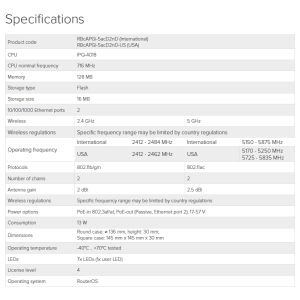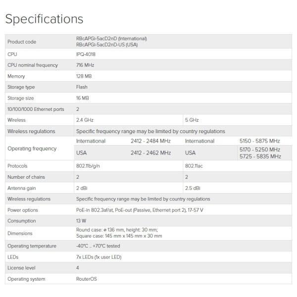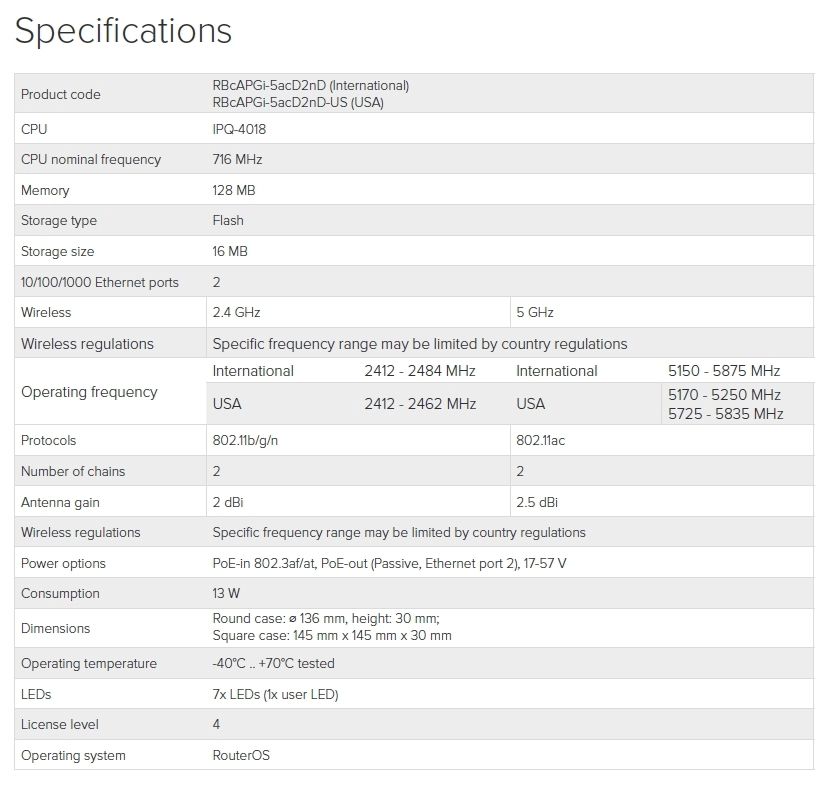 RBcAPGi-5acD2nD/CAP ac (stropný Access Point) je stropná dual band AP od mikrotík s modulačnými rýchlosťami 300 Mbps (2.4GHz) a 866Mbps (5GHz). Navrhnuté bolo tak, aby maximálne splynulo s miestom inštalácie, ideálne pre hostinské činnosti, ako reštaurácie, hotely, letiská, nákupné centra, atď... CAP ac podporuje 802.11a/b/g/n/ac a môže byť napájané pomocou pasívneho PoE. Je to ideálne zariadenie pre MikroTik CAPsMAN (riadený správca AP systému), ktorý umožňuje ovládať všetky AP zariadenia z jedného centrálneho miesta.