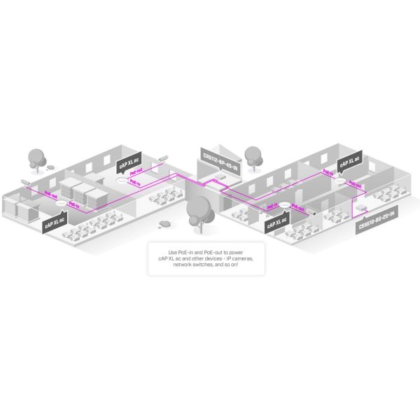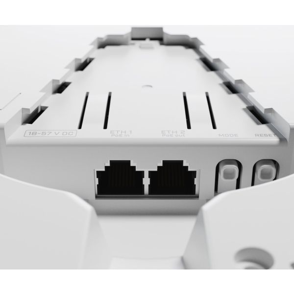 - cAP XL ac podporuje vstup PoE 802.3af/at na prvom porte a pasívny výstup PoE (až 57 V) na druhom porte.