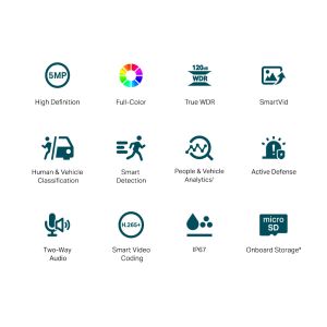 IP kamera vonkajší, rozlíšenie 5 Mpix, ohnisko 2.8 mm, nočné videnie do 30 metrov, prísvit bielym svetlom (do 30 m), farebné nočné videnie, múdra detekcia osôb/pohybu, klasifikácia osôb/vozidiel. Rozhranie: LAN s podporou PoE, slot pre pamäťové karty. Krytie IP67.