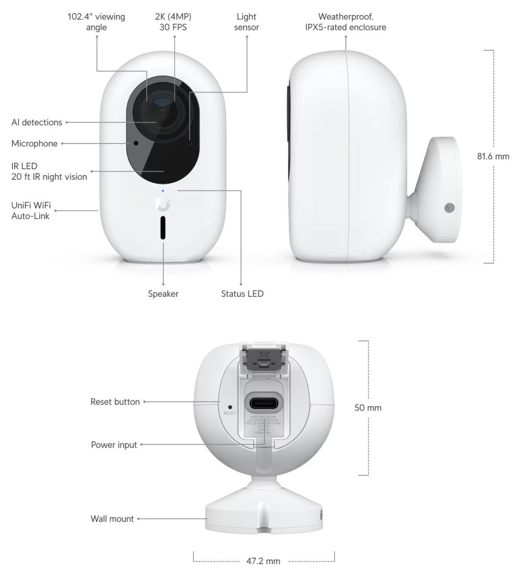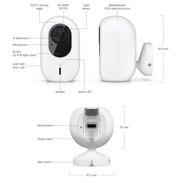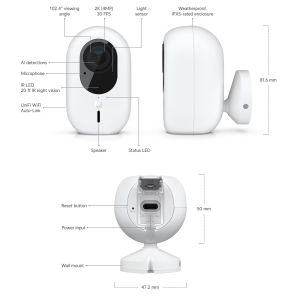UniFi Protect G4 Instant kamera disponuje 5MP snímačom (2688x1512px) pri 30fps, fixným objektívom 2,8mm, IR prísvitom na nočné videnie, mikrofónom a reproduktorom. Kamera má robustné a kompaktné telo z polykarbonátu, odolnosť IK04 proti vandalom a krytie IPX5 proti tryskajúcej vode. Do siete sa kamera pripája pomocou Dual-Band WiFi s podporou štandardov 802.11a/b/g/n/ac a napájanie je riešené cez USB-C kábel (5V/2A) s maximálnou spotrebou 6W.