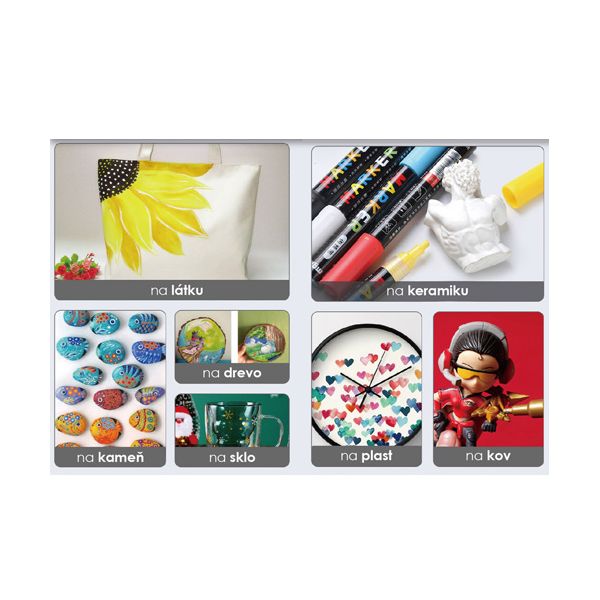 Dekoračný popisovač je vhodný na maľovanie povrchov ako: kameň, keramika, porcelán, sklo, drevo, textil, plátno, kov, drevo, plast, polymérová hlina a pod.