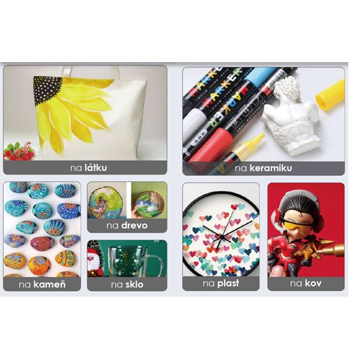 Dekoračný popisovač je vhodný na maľovanie povrchov ako: kameň, keramika, porcelán, sklo, drevo, textil, plátno, kov, drevo, plast, polymérová hlina a pod.