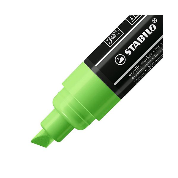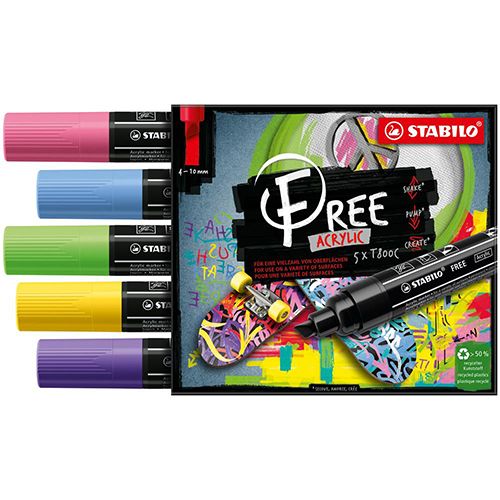 S radom STABILO FREE Acrylic Marker môžete takmer neobmedzene navrhovať a individualizovať. K dispozícii sú popisovače s tromi starostlivo vybranými variantmi hrotov a až 20 krycími farbami. Nepriehľadná a svetlostála pigmentová akrylová farba, vhodná na takmer všetky povrchy,od papiera cez kameň až po keramiku, umelú kožu a drevo. Každý môže nechať voľný priebeh svojej kreativite pri písaní, maľovaní, značkovaní, šrafovaní a kontúrovaní. Akrylový popisovač s pigmentovaným atramentom na vodnej báze - v troch šírkach stopy (T100, T300, T800C) s až 20 farbami - vhodný na rôzne povrchy, napr. papier, kartón, plátno, kameň alebo umelú kožu - nepriehľadný, permanentný, vodeodolný, ľahký a odolný voči poveternostným vplyvom -možno miešať a miešať s vodou - po zaschnutí, hodvábne matný a pretierateľný - vyrobený z 50% recyklovaného plastu - jednoduchá aktivácia pretrepaním po dobu 30 sekúnd a následné pumpovanie - horizontálne skladovanie pre dlhú životnosť