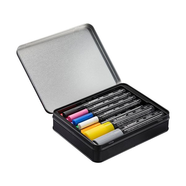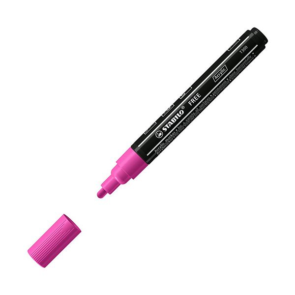 S radom STABILO FREE Acrylic Marker môžete takmer neobmedzene navrhovať a individualizovať. K dispozícii sú popisovače s tromi starostlivo vybranými variantmi hrotov a až 20 krycími farbami. Nepriehľadná a svetlostála pigmentová akrylová farba, vhodná na takmer všetky povrchy,od papiera cez kameň až po keramiku, umelú kožu a drevo. Každý môže nechať voľný priebeh svojej kreativite pri písaní, maľovaní, značkovaní, šrafovaní a kontúrovaní. Akrylový popisovač s pigmentovaným atramentom na vodnej báze - v troch šírkach stopy (T100, T300, T800C) s až 20 farbami - vhodný na rôzne povrchy, napr. papier, kartón, plátno, kameň alebo umelú kožu - nepriehľadný, permanentný, vodeodolný, ľahký a odolný voči poveternostným vplyvom -možno miešať a miešať s vodou - po zaschnutí, hodvábne matný a pretierateľný - vyrobený z 50% recyklovaného plastu - jednoduchá aktivácia pretrepaním po dobu 30 sekúnd a následné pumpovanie - horizontálne skladovanie pre dlhú životnosť