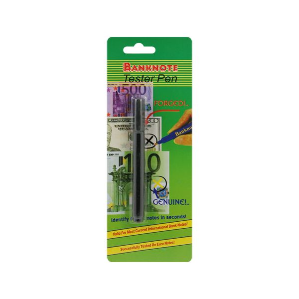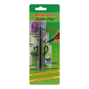 Špeciálne overovacie / testovacie pero na overovanie pravosti bankoviek na základe chemickej reakcie papiera. Použitie tohto detekčného pera je veľmi jednoduché: označte bankovku na svetlom nepotlačenom mieste, ak sa popísané miesto vyfarbí na čierno, jedná sa pravdepodobne o falošnú bankovku. Šírka stopy 2,5 mm. -jednoduché použitie -okamžitý výsledok -bankovka zostane po použití čistá, nepopísaná -možnosť testovania všetkých bankoviek, okrem polymérových -až 6.000 testov s jedným perom -veľmi dobrý pomer ceny/efektivity