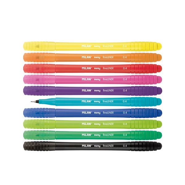 Sada linerov MILAN s jemným hrotom 0,4 mm. SWAY dizajn s ergonomickým okrúhlym tvarom, vám zaručí pohodlné písanie. Atrament na vodnej báze. Liner SWAY uspokojí každého, kto si rád farebne vyznačuje texty, robí farebné poznámky, či kreslí. K dispozícii je 10 farieb: žltá, oranžová, červená, ružová, fialová, modrá, svetlo modrá, zelená, svetlo zelená a čierna - z každej farby po 8 ks.