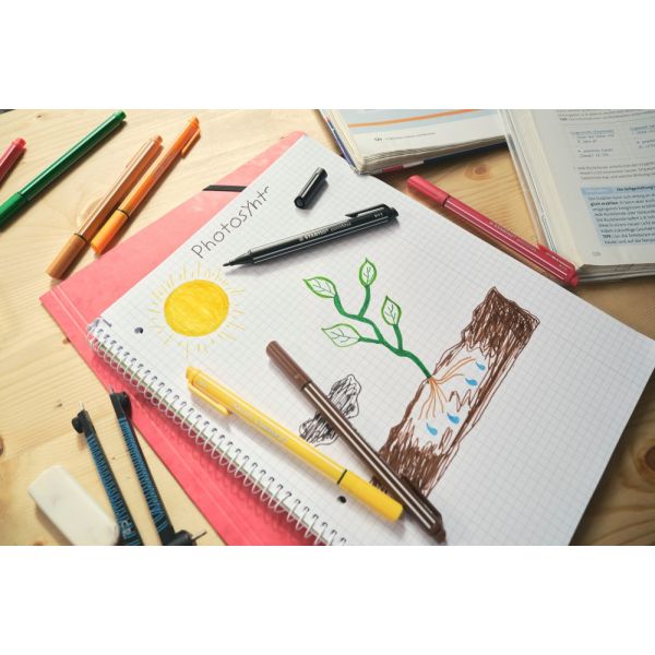Jednorazový liner. Vláknový hrot v kovovej objímke, telo linera vo farbe atramentu. Ventilačný uzáver vo farbe atramentu so šesťhranným hrotom. Atrament na vodnej báze, odolný voči vysychaniu, bez zápachu, netoxický.dĺžka písacej linky: 500-600mpísacia čiara: 0,4 mmhrot: 0,4 mmdodáva sa v 4 farbách (čierna, červená, modrá, zelená) v balení 10 kusov v jednej farbeideálne na vytváranie farebných poznámok, prácu so šablónou atď.pre použitie v kancelárii, škole aj domácnosti