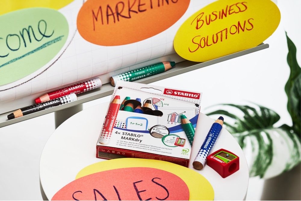 STABILO MARKdry je suchý popisovač s hrubou farebnou tuhou na biele tabule a flipcharty.