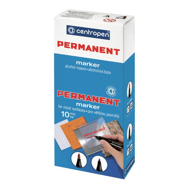 Permanentný popisovač - čierny. Píše na väčšinu povrchov - píše na papier, gumu, kožu, plasty, kovy. Odolá vode, oteru, poveternostným vplyvom. Atrament na alkoholovej báze. Valcový hrot so šírkou stopy 2 mm.
