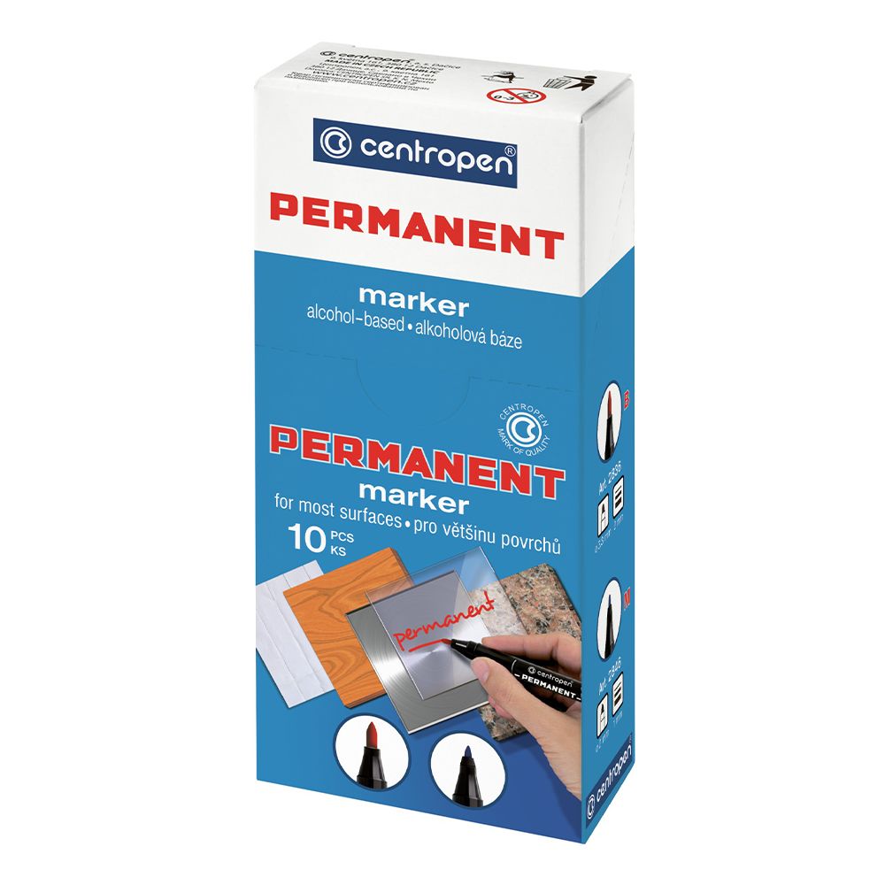 Permanentný popisovač - červený. Píše na väčšinu povrchov - píše na papier, gumu, kožu, plasty, kovy. Odolá vode, oteru, poveternostným vplyvom. Atrament na alkoholovej báze. Valcový hrot so šírkou stopy 2 mm.