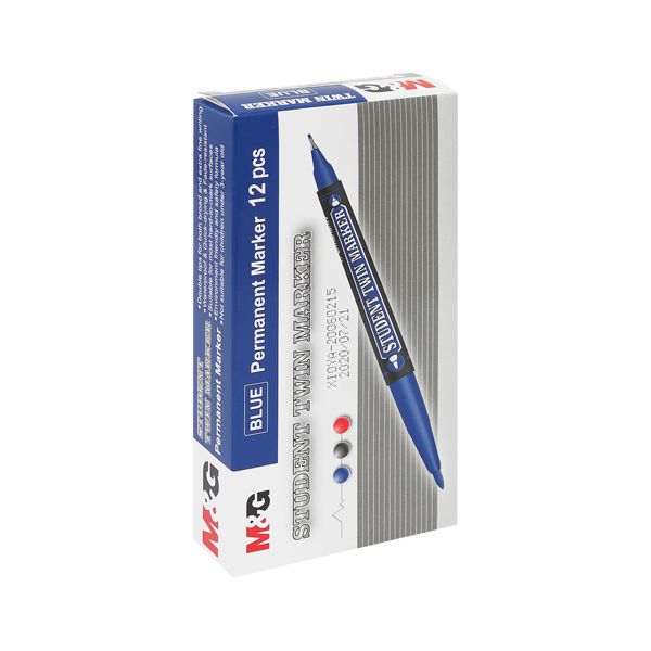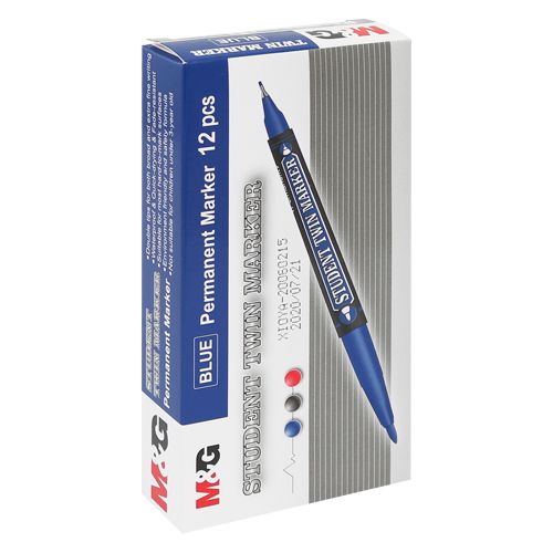 Obojstranný permanentný popisovač Student Twin Marker M&G. Permanentný atrament na báze liehu, odolný voči vode a vyblednutiu, rýchloschnúci. Píše na papier, gumu, kožu, plasty, kovy. Extra tenký hrot – šírka stopy 0,5 mm. Tenký hrot – šírka stopy 1,0 mm. Farba: modrá.