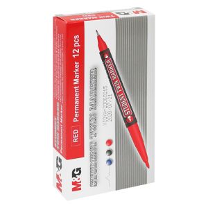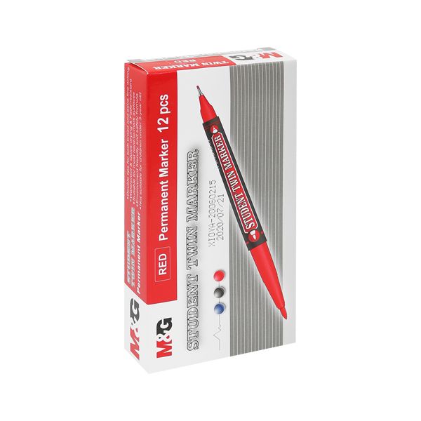 Obojstranný permanentný popisovač Student Twin Marker M&G. Permanentný atrament na báze liehu, odolný voči vode a vyblednutiu, rýchloschnúci. Píše na papier, gumu, kožu, plasty, kovy. Extra tenký hrot – šírka stopy 0,5 mm. Tenký hrot – šírka stopy 1,0 mm. Farba: červená.