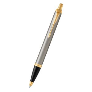 Guľôčkové pero Parker IM Brushed Metal GT s brúseným mosadzným telom a viečkom s lakovanou povrchovou úpravou v kombinácii s doplnkami pokovovanými zlatom a leštenou úpravou.