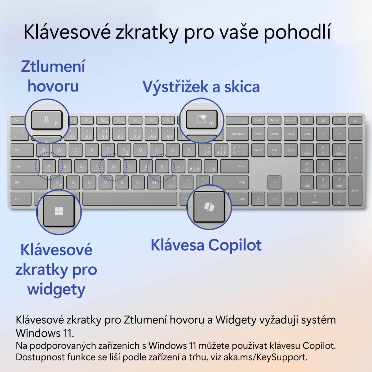 Vďaka klávesu Copilota pri klávesnici pre Surface máte vo Windows 11 výhody umelej inteligencie na dosah ruky. Táto elegantná klávesnica umožňuje klasické písanie so zabudovanou numerickou časťou a vyhradenými klávesmi pre rýchly prístup k funkciám výstrižky a skica, expresívne vstup, stlmenie hovoru a ďalším.