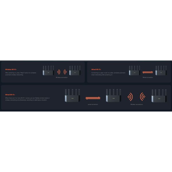 Router podporuje pripojenie k sieťam Mesh pomocou Wi-Fi+ Mesh a je tak možné ho kombinovať s ďalšími Tenda Mesh systémami.