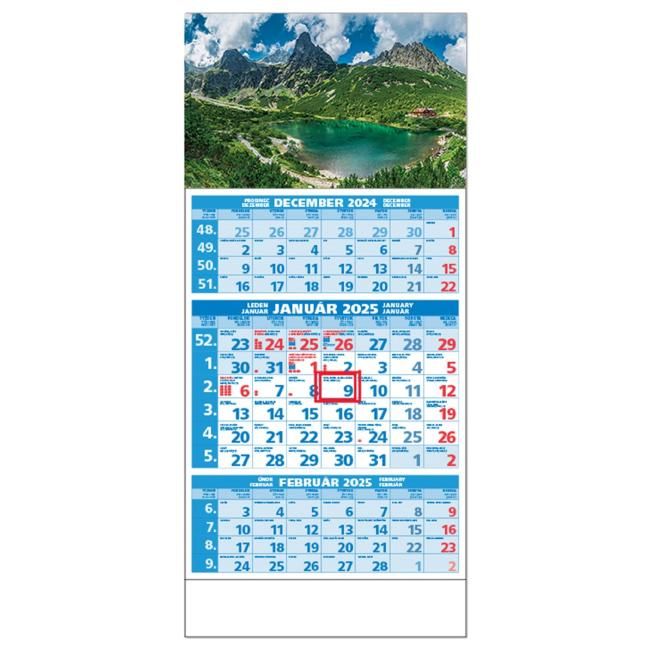 Formát kalendára: 31,5 x 45 cmKalendárium: české/slovenské trojmesačné so sviatkami európskych štátov (CZ / SK / A / B / D / F / H / CH / I / PL / RUS / UKR)Rozsah kalendára: 12 listovPriestor na potlač: 31,5 x 7 cm