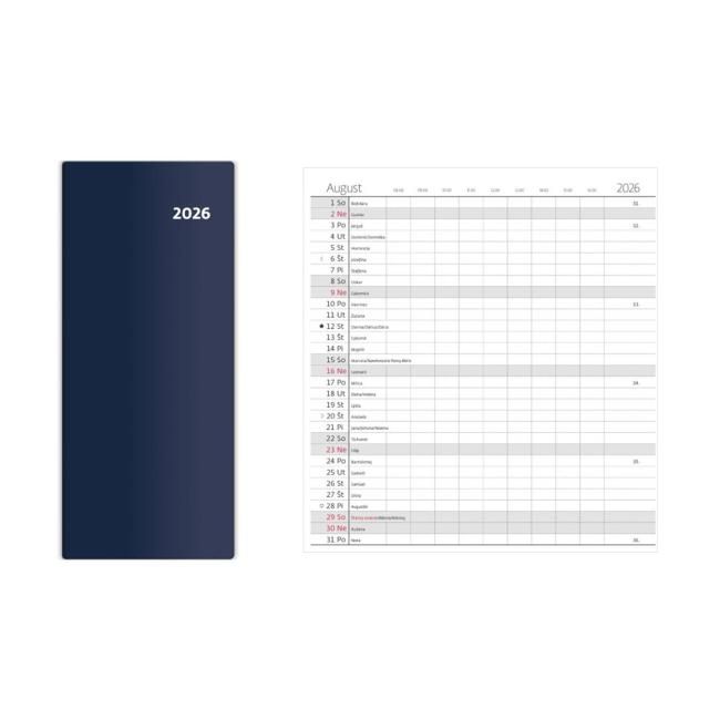 Rozmer: 148 x 210 mmFormát: A5Kalendárium: slovenské týždenné + jedna voľná strana na poznámkyRozsah: 128 stránPapier: bielyMateriál dosiek: hladká koženkaHlavný jazyk: slovenčinaĎalšie jazyky: CZInfostrany obsahujú:SK/CZ krstné mená, štátne sviatky SK/CZMesačný plánovač 2025 a 2026Prehľadný kalendár 2025 a 2026Plánovací kalendár, Daňový kalendár, Poznámky