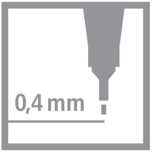 Jednorazový liner. Vláknový hrot v kovovej objímke, telo linera vo farbe atramentu. Ventilačný uzáver vo farbe atramentu so šesťhranným hrotom. Atrament na vodnej báze, odolný voči vysychaniu, bez zápachu, netoxický.dĺžka písacej linky: 500-600mpísacia čiara: 0,4 mmhrot: 0,4 mmdodáva sa v 4 farbách (čierna, červená, modrá, zelená) v balení 10 kusov v jednej farbeideálne na vytváranie farebných poznámok, prácu so šablónou atď.pre použitie v kancelárii, škole aj domácnosti