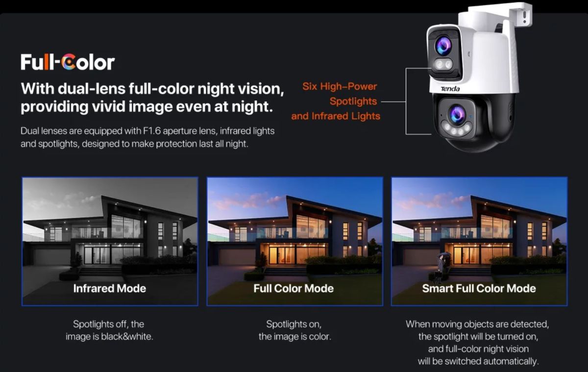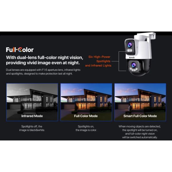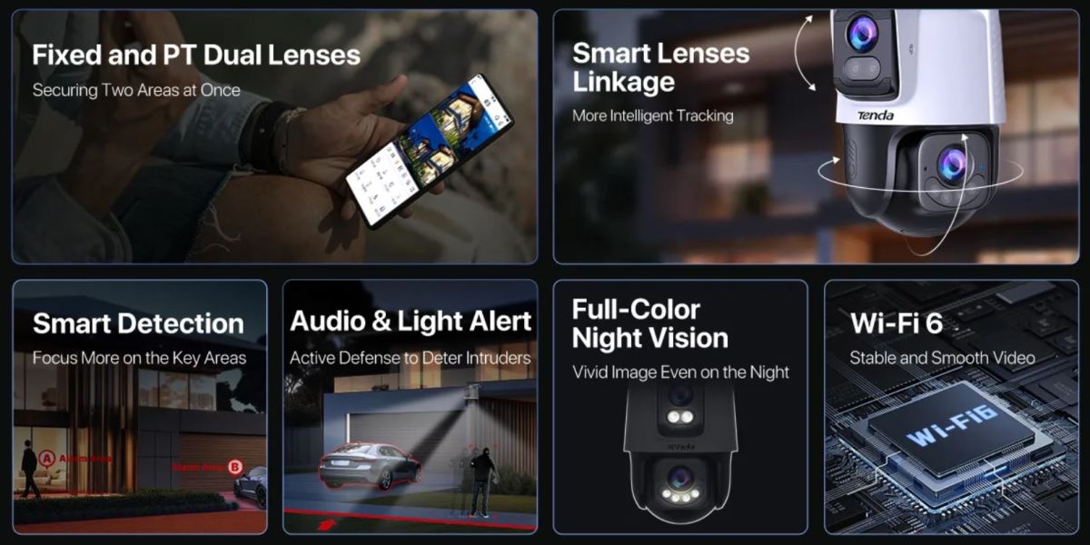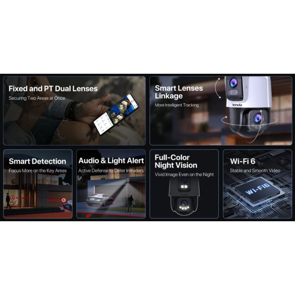 Tenda RH9-WCA - Vonkajšia otočná Dual Lens IP65 Wi-Fi 6 MPx kamera, nočná LED, audio, detekcia, CZ app 75012014