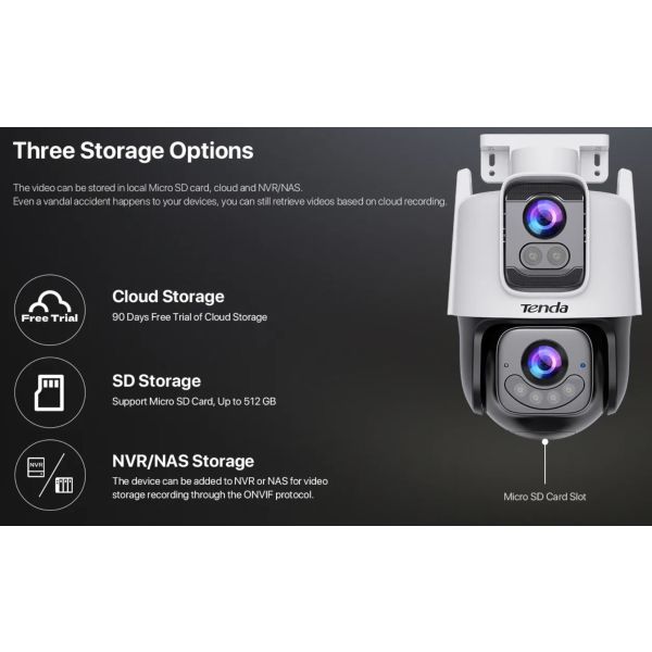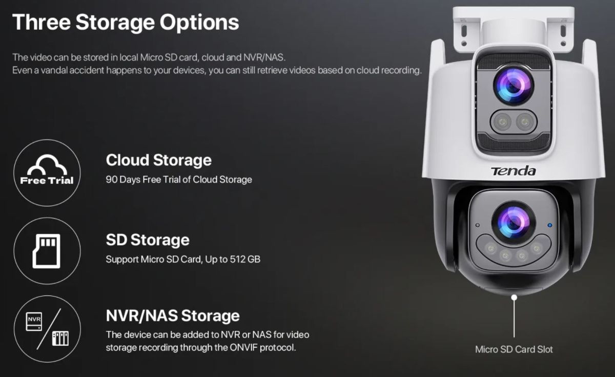 Kamera ukladá dáta do vnútorného alebo Cloudového úložiska. Vnútorné úložisko je tvorené slotom pre microSD kartu maximálnej kapacity 512 GB. Tiež je možné priamo v aplikácii TDSEE prikúpiť Cloudové úložisko, dáta sú tak chránené proti odcudzeniu alebo poškodeniu kamery. Cloudové úložisko je európske a spĺňajme normy na ochranu osobných dát ISO/IEC 27018. Data sú špeciálne kódované pomocou AES 256-bit šifrovania. Onvif protokol je veľmi dôležitý pre pripojenie kamery k iným systémom. Vďaka podpore Onvif protokolu je možné kameru pripojiť k NVR rekordérom, NAS serverom a ďalším zariadeniam akejkoľvek značky, stačí aby podporovala štandard Onvif.