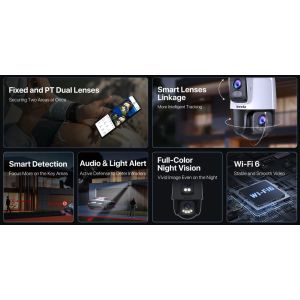 Vonkajšia otočná IP kamera s dvojitou optikou a rozlišením celkom 6MP (2ks 2304 × 1296) a prenosom zvuku, uhol záberu 360° horizontálne a 90° vertikálne, podporou OnVif, nočné videnie s dosvitom 30 m, detekcia pohybu a osoby, automatické otáčanie siréna, cloud platforma, slot pre SD kartu max. 512 GB, krytie IP65, pripojenie cez WiFi 6 a Ethernet RJ45, aplikácia pre Android a iOS v češtine.