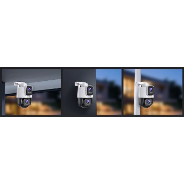 Vonkajšia otočná IP kamera s dvojitou optikou a online sledovaním pomocou mobilného telefónu a tabletu. Ukladanie záznamov a fotografií na microSD kartu alebo Cloud. Rozlíšenie 2x 3MP pre video vo vysokej kvalite, denný aj nočný prevádzku vďaka IR dosvitu až 30 m, ohnisková vzdialenosť pri fixnej kamere 4,0 mm a pri otočnej kamere 6,0 mm, Wi-Fi b/g/n, 1x LAN RJ45 10/100 Mb 512 GB. Uhol záberu 360° horizontálne a 90° vertikálne. Kamera podporuje detekciu pohybu, detekciu osoby a automatické otáčanie za pohybom/osobou. Súčasťou balenia je držiak na stenu / strop.