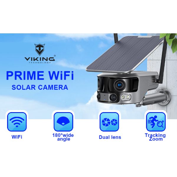 Solárna kamera Viking PRIME-WiFi, ktorá disponuje panoramatickými čočkami s 180 ° uhlom pohľadu, IP66 ochranou (platí iba v prípade, že sú všetky vstupné aj výstupné konektory zakryté napr. silikónovým ochranným krytom), PIR čidlom, detekciou ľudského pohybu a nočným videním. Ku kamere je taktiež možné pripojiť výkonný solárny panel, vďaka ktorému je kamera nezávislá na elektrickej sieti.