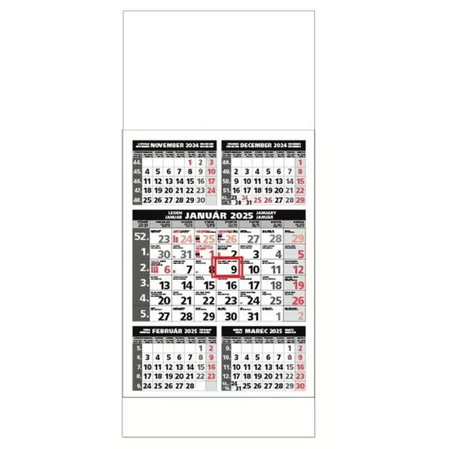 Plánovací kalendár s 5-mesačným kalendáriom s menami v SK+CZ, názvy mesiacov a dní v SK, CZ, UK, DE a HU.Rozmer : 295 x 663 mm. Väzba šitá s perforáciou. Názvy mesiacov v SK, CZ. UH, DE, HU.
