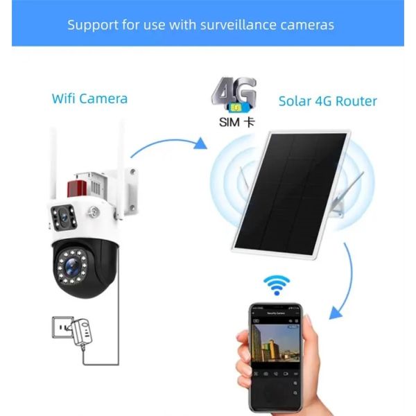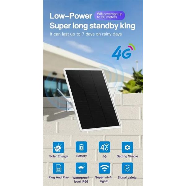 4G pripojenie · WiFi 2.4GHz · solárne napájanie 15W · WiFi až pre 8 zariadení · rýchlosť sťahovania až 150 Mbps · podpora LTE/WCDMA pásma · výdrž batérie až 50 hodín · odolnosť proti teplotám -15°C až 75°C · bezpečnostné režimy WPA-PSK, 2 karta