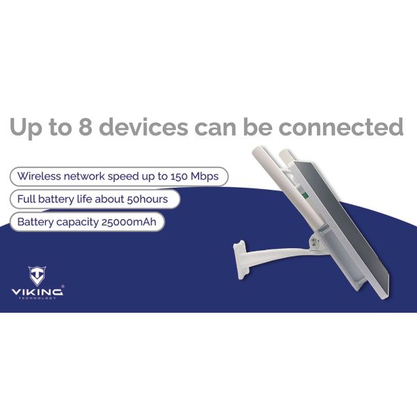 Solárny router Viking R09 4G je vybavený bateriou s kapacitou 25 000 mAh, ktorá umožní až 50 hodín prevádzky na jedno nabitie. Napájanie batérie je zabezpečené solárnym panelom s výkonom 15W.