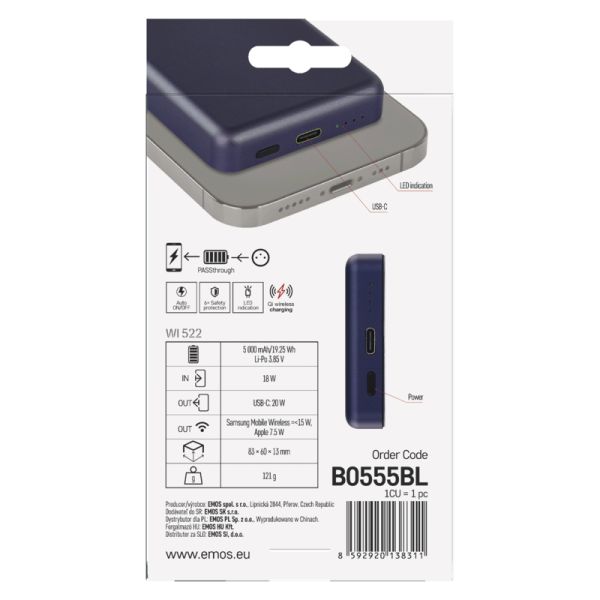 EMOS POWERBANKA WI 522, bezdrôtové nabíjanie 20W, 5.000mAh, MODRÁ, 1xUSB-C 1613055502