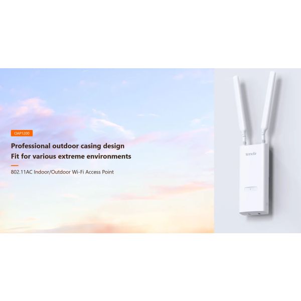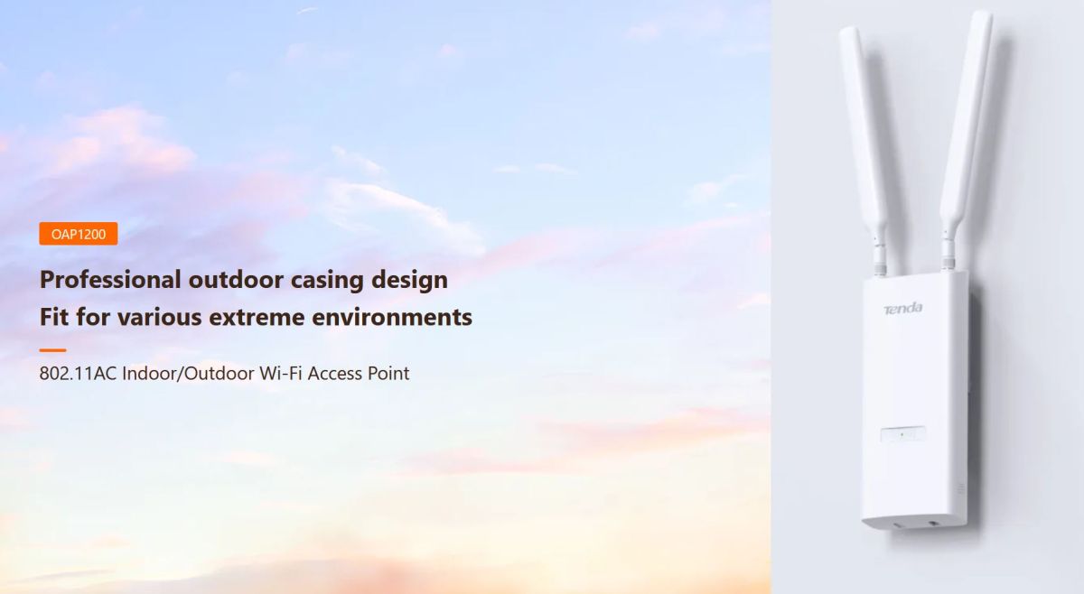 Tenda OAP1200 je bezdrôtový Wi-Fi prístupový bod (Access Point) pre vonkajšie aj vnútorné použitie, podporuje štandardy 802.11ac(wave2)/a/b/g/nv pásme 2,4 a 5 GHz s rýchlosťou až 1167 Mb/ss technológiou MU-MIMO, OFD. Podporuje rýchly prechod klientov Fast roaming 802.11 k/v/r. Obsahuje 1x Gigabitový LAN port, ktorý podporuje aktívne PoE 802.3af napájanie ale aj pasívne napájanie (24V 0,5A). Podpora 12x SSID (8x 2,4 GHz + 4x 5GHz), VLAND tagging, AP Isolation a ďalšie technológie, pripojenie až 256 klientov. Obsahuje držiak na umiestnenie na stenu, strop, stĺp a pod.