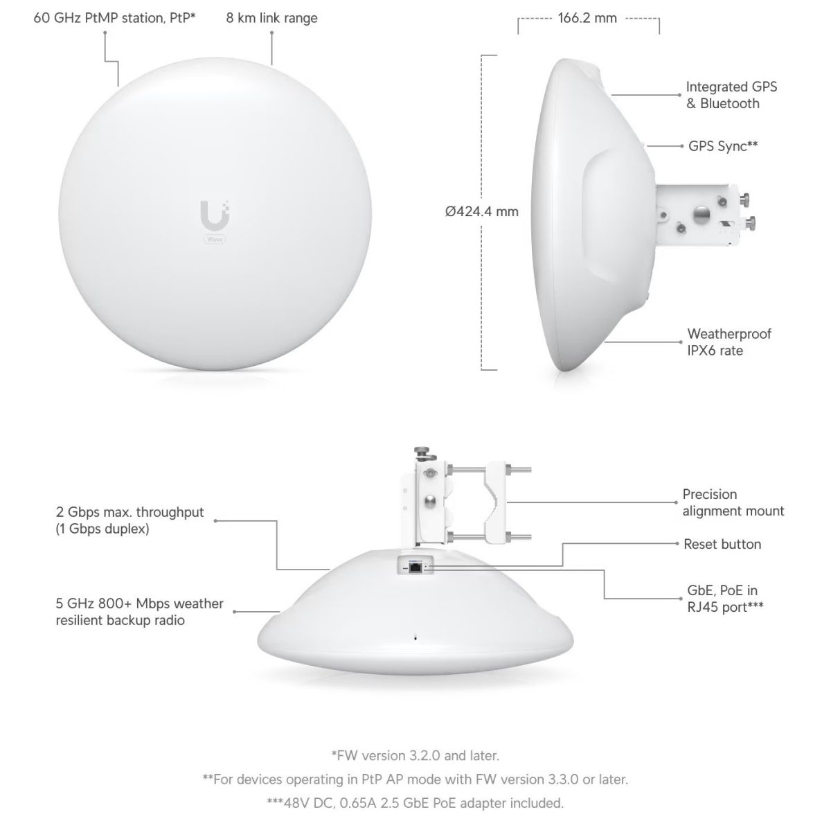 Môže sa pripojiť k Wave AP a poskytovať celkovú priepustnosť 2Gbps (1Gbps duplex). Wave Long-Range je vybavený vysoko výkonným 5GHz záložným pásmom, ktoré zaisťuje neprerušované pripojenie, a Bluetooth pre zjednodušenie nastavenia prostredníctvom aplikácie UISP® Mobile.