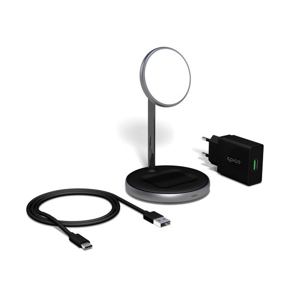 Epico 2in1 Magnetic Wireless Charger je magnetický stojan, ktorý kombinuje funkciu duálneho bezdrôtového nabíjania s prémiovým designom. Je kompatibilný s MagSafe a ponúka silné magnetické uchytenie na neprerušované nabíjanie. Dokáže nabíjať váš smartfón maximálnym výkonom 15W (7,5W pre iPhone) a vaše AirPods výkonom až 5W. Slouží aj ako praktický stojan pre iPhone, ktorý vám umožní sledovať videa alebo telefonovať v preferovanom uhle. Vďaka LED indikátoru môžete kontrolovať stav nabíjania. Súčasťou balenia je USB-C kábel a 18W QC sieťový adaptér.