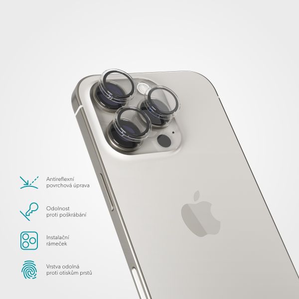 Ochrana pre čočky fotoaparátu, pre Apple iPhone 16 Pro/16 Pro Max, tvrdené sklo, tvrdosť 9H, súčasťou: inštalačný rámček.