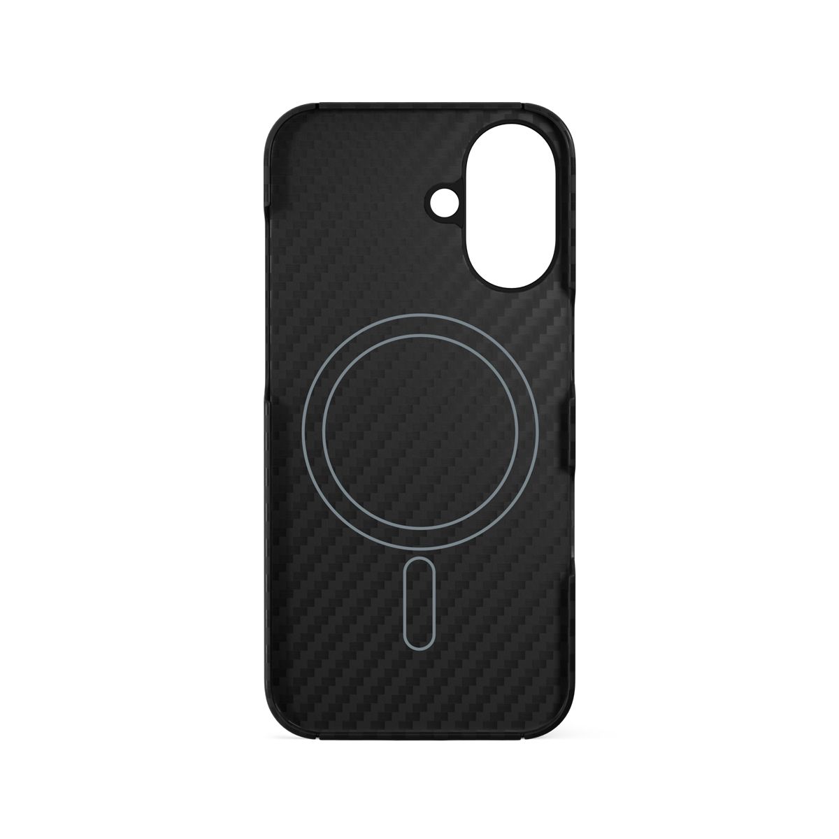 Kryt na telefón, pre Apple iPhone 16 Plus, kompatibilný s MagSafe, materiál aramidové vlákno, hliníkový rámik okolo objektívov, farba čierna.