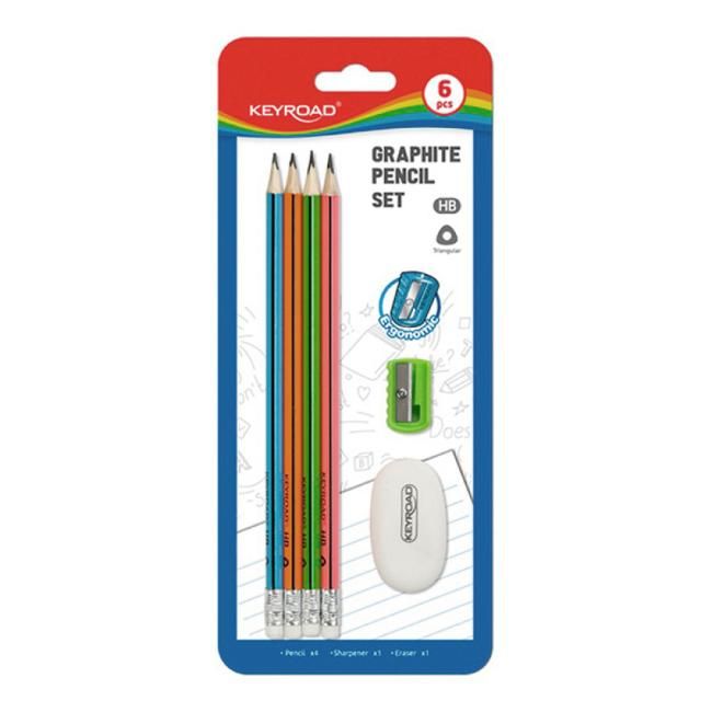 Sada školských pomôcok KEYROAD, 6 ks: drevená ceruzka HB trojuholníková, s gumou 4 ks, plastové strúhadlo 1 ks, guma 1 ks. Balenie: blister. Farba: mix farieb.