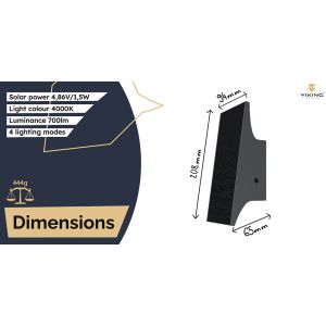 Svietivosť 700 lm • solárne napájanie • farba svetla 4000K (denná biela) • 4 režimy osvetlenia • doba osvetlenia za nevhodných podmienok až 3 dni • odolnosť IP65 • kapacita batérie 3,7V/7,4Wh • výkon solárneho panelu 4,86V/1,5W