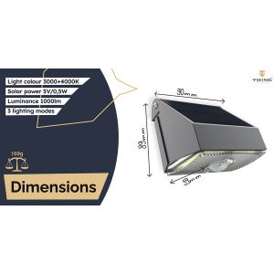 Svietivosť 1000 lm • solárne napájanie • farba svetla 3000K + 4000K (teplá a denná biela) • 3 režimy osvetlenia (včítane PIR senzora) • doba osvetlenia za nevhodných podmienok až 3 dni • odolnosť IP54 • kapacita batérie 3,7V/7,4Wh
