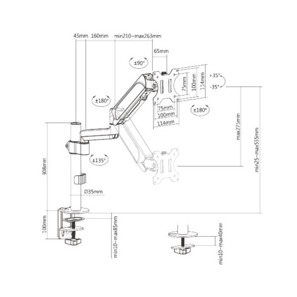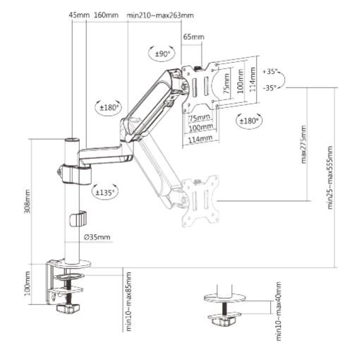 • Flexibilné nastavenie polohy: Držiak umožňuje ľahké nastavenie výšky pomocou plynovej vzpery, nastaviteľný náklon monitora v uhle +35°/-35°, otočenie monitora o 360°, nastavenie uhlov ramena o 180°, takže môžete ľahko nájsť optimálnu pozíciu pre pohodlné a ergonomické používanie. Odnímateľná deska VESA umožňuje jednoduchú inštaláciu monitora.